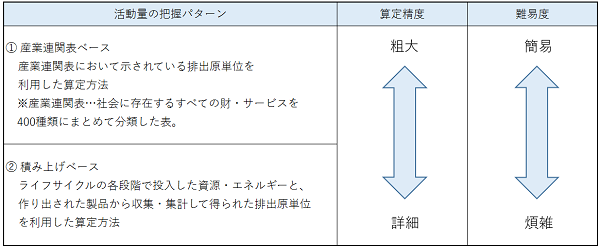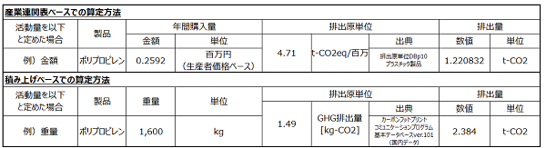 なお、一般的に、産業連関表ベースと積み上げベースを比較した場合、産業連関表ベースでの算定の方が、排出量が多くなります。ただし、上記のポリプロピレンの例のように、積み上げ排出量が多いわりに価格が安い製品の場合、積み上げベースの排出量の方が多くなることもあります。