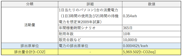 カテゴリ11においては、製品の使用段階において「どのように使用されるか」といったシナリオの作成が必要です。例えば、パソコンを例にした想定シナリオは下記となります。1日当たりのパソコン1台分の消費電力や年間稼働時間などを想定し、電力の排出原単位を掛け合わせて、CO2排出量を算定します。
