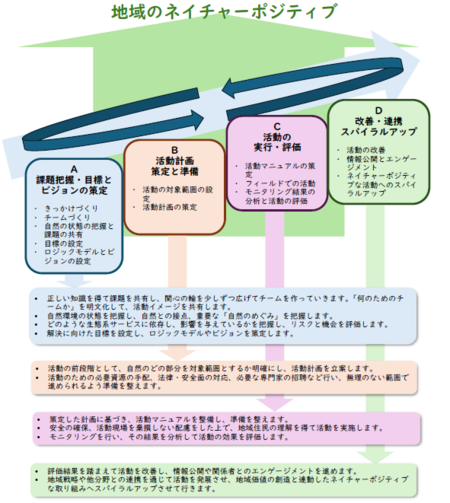 | Step 4: スパイラルアップと連携 (Phase D) | 活動の成果と課題を基に改善のサイクルを回し、活動をより高次なものへと「スパイラルアップ(循環的発展)」させる。最終的には、自治体の政策や企業の経営戦略にネイチャーポジティブの視点を組み込み、地域社会全体に定着させることを目指す。(P61~73) |
