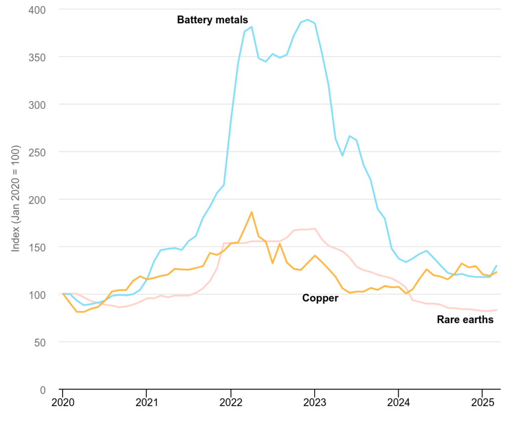 世界の鉱物市場は、経済成長、技術革新、地政学的要因など、多様な要素に影響を受けながら常に変動しています。近年、特にクリーンエネルギー技術の発展に伴い、リチウム、コバルト、ニッケルなどのバッテリー材料(バッテリーメタル)や、ネオジム、セリウム、ジスプロシウムといった先端技術に不可欠な鉱物の需要が急増しています。バッテリーメタルは、2022~2023年においてEV向け需要への期待感や、鉱山事故等による供給懸念により価格が急上昇しましたが、EV向け需要の推移が市場の期待と異なったことで価格が低迷し、コバルトなどは生産過剰状態に陥るなど、市場が大きく乱高下しています。