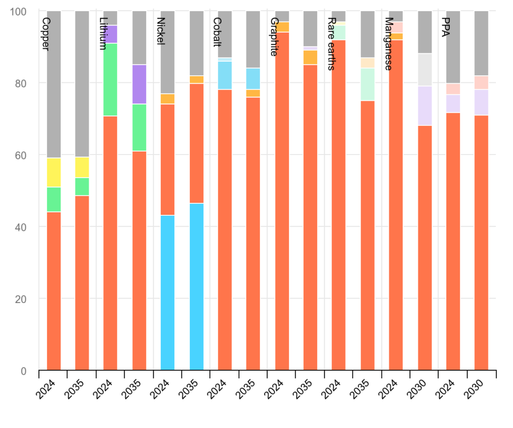 多くの鉱物について、それらを生産できる国は限られており、中でも中国は多くのレアメタルやレアアースの生産・精製において圧倒的なシェアを占めています。国際エネルギー機関(International Energy Agency、以下IEA)が公表する情報によると、レアアースの精製能力において、2024年には中国が占める割合が9割以上になったと報告しています。2030年にかけて中国の占有割合は減少していくものの、引き続き全体の多くの割合を占めると予想されています。
