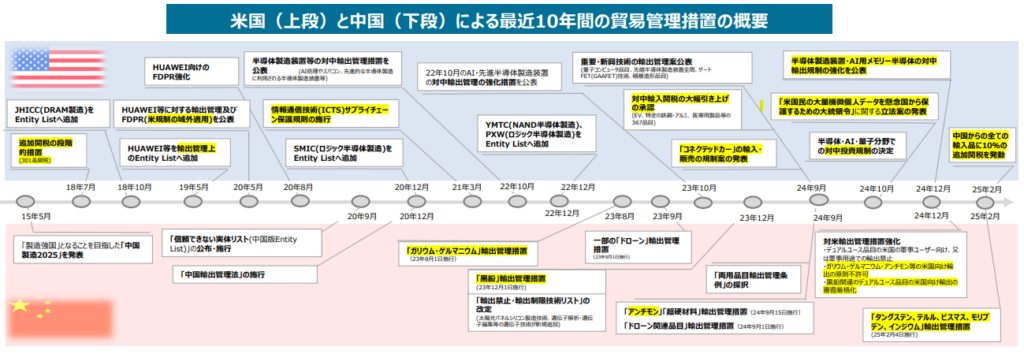 これまで米国は自国の国際的優位性を高めるため、資源や製品の輸出入に様々な規制や関税をかけてきました。特に、世界市場の覇権を争うもう一方の超大国・中国に対しては、多品目に渡る関税引き上げ、半導体製造装置・AI用メモリー半導体の輸出規制など、重点的な施策を打ち出しています。