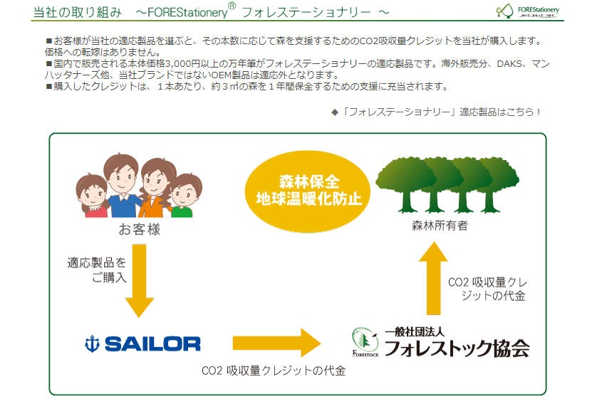 同社は、2013年8月1日より「フォレストック認定制度」を活用した『FOREStationery(R) フォレステーショナリー』プロジェクトを実施しています。「適応製品(本体価格3,000円以上)となる万年筆1本につき、1年間約3㎡の森林の保全活動を支援します。」というメッセージを発信し、顧客の万年筆購入に応じて、CO2吸収量クレジットを購入しています。これは、文具業界としては初の取り組みでした。(画像はクリックすると拡大します)