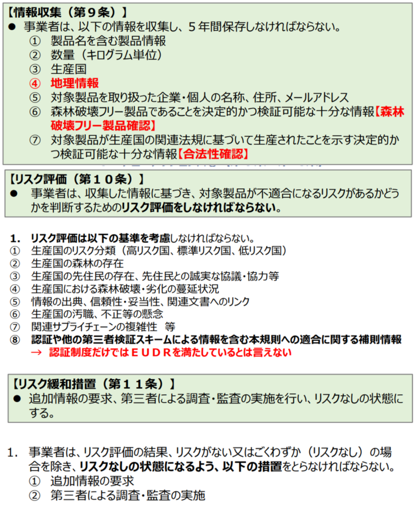 企業は、サプライチェーンに関する関連情報(位置情報データやリスク査定など)を含む、デューデリジェンス(適正評価)過程の証拠を、各国の管轄当局に提出する必要があります。具体的に、企業は製品の内容、生産地の情報、事業者情報、森林破壊を伴わない製品であることを証明する情報、合法性を示す情報をもとにデューデリジェンスのステートメントを作成し、EUのITシステムに報告しなければなりません(情報収集)。その情報に基づき、規則への不適合リスクを評価し、リスクがあればリスク緩和する措置を実施する必要があります(リスク評価とリスク緩和措置)。また、事業者はデューデリジェンスステートメントを構築し、年一回見直す必要があります。