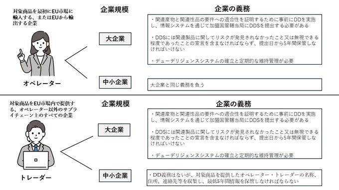 EUDRでは、事業者について①オペレーターと②トレーダーを区別し、さらに大企業と中小企業でそれぞれ異なる義務を課しています。ここでのオペレーターとは、対象商品を最初にEU市場に輸入する、またはEUから輸出する企業を指します。また、トレーダーとは、対象商品をEU市場内で提供する、オペレーター以外のサプライチェーン上のすべての企業を指します。オペレーターは規模に関係なく、すべての事業者が、当該品目の生産において森林減少を引き起こしていないことを確認する必要があります(デューデリジェンス義務)。また、大企業トレーダーは大企業オペレーターと同じ義務を負う一方、中小企業トレーダーは、大企業トレーダーのようにデューデリジェンス義務を負いません。しかし、対象商品を提供したオペレーター・トレーダーの名称、住所、連絡先等を収集し、最低5年間情報を保管する必要があります。