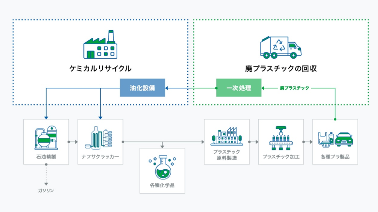 三菱ケミカル、ENEOSは、廃プラスチックのケミカルリサイクル(油化技術など)に共同で取り組み、再生された油を石油製品やプラスチック原料として再製品化しています。将来的には実証プラントから商業プラントへの移行を検討しており、商業運転を通じてさらなる大型化、より多くの廃プラスチック処理の実現を目指しています。