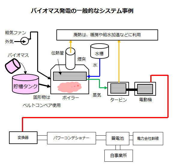 一般的には、ボイラーにバイオマス燃料を燃焼することで高圧の蒸気を発生させ、その蒸気を使用してタービンを回転、電動機を介して電力発電させるシステムです。石油・石炭・天然ガスなど火力発電の燃料がバイオマス燃料に置き換わったようにイメージしてください。主に燃料となるのは木材(間伐材・廃材など)やカロリーを含んだ廃棄物などです。