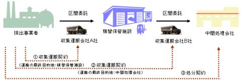 積替保管は一つの収集運搬会社が行う場合と、複数の収集運搬会社が関与する場合があります。後者の場合は区間ごとに収集運搬会社に委託をするので、一般に「区間委託」といいます。「区間委託」の場合は以下の点に気をつけましょう。