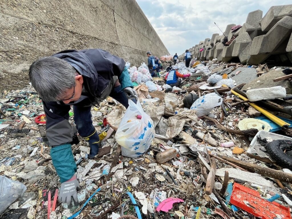 私も里海づくり推進専門官として、各地の現場に赴き、海洋ごみ回収の取組に参加しています。2024年2月、香川県最大のホットスポットと呼ばれている干拓地を訪ねました。堤防と消波ブロックの間に大量の海洋ごみが漂着し、ペットボトル、発泡スチロールの破片、カキ養殖用のパイプ、プラスチック製の部品、廃タイヤなどが何重にも層になっていて、直径5ミリ以下まで小さくなったマイクロプラスチックも散乱していました。あまりの量の多さに言葉を失い、いくら回収しても状況が変わらず無力感すら抱きました。それでも海岸清掃ボランティアや地方自治体の職員と力を合わせ、自問自答しながら回収を続けました。どこから漂着したごみなのか?海への流出を防げなかったのか?