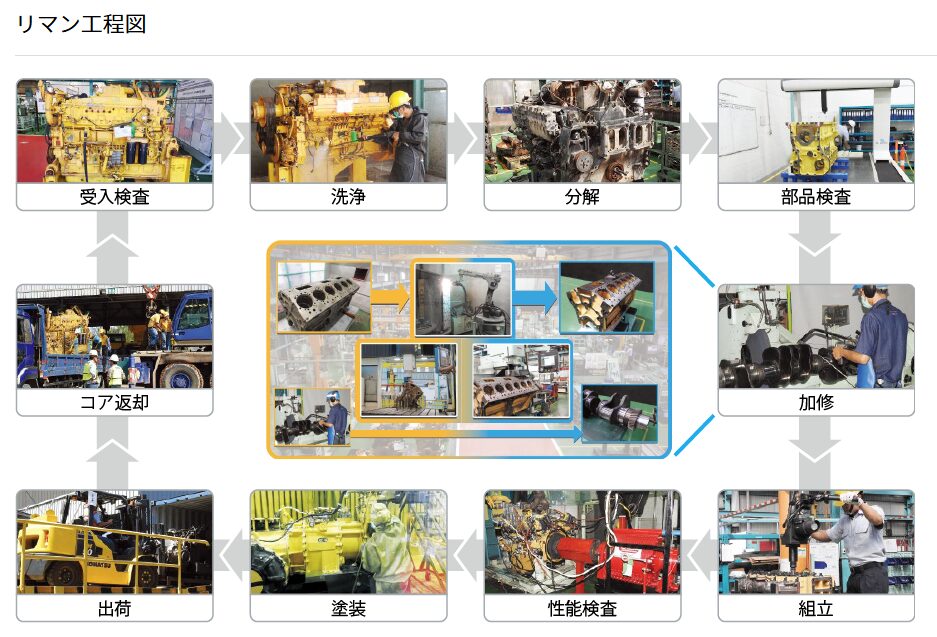 またコマツは、顧客の元で長期間稼働した建設・鉱山機械のエンジンやトランスミッションなどのコンポーネントを取り外して交換するアフターサービスを提供しています。回収したコンポーネントを分解、洗浄、修理、再塗装等し、新品同様に蘇らせて再び市場に供給する「リマン事業(コンポーネントの再生ビジネス)」においても、ICTが重要な役割を担っています。