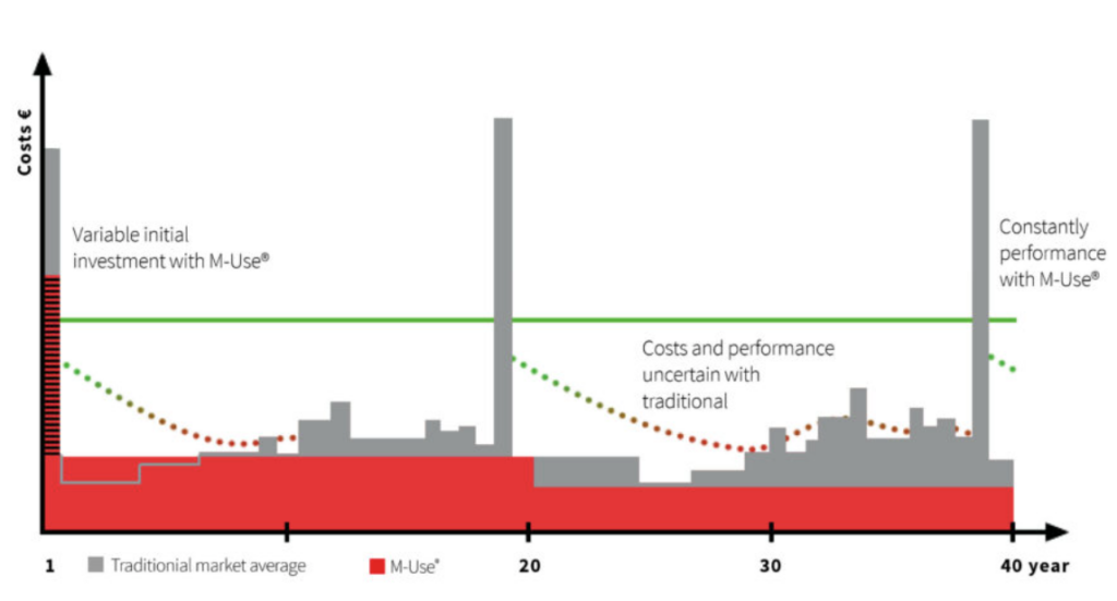 オランダに本社を置く三菱エレベータヨーロッパ社は、エレベータを「Vertical Mobility(垂直なモビリティ)」と定義し、従量課金制のサービスM-Use®を提供しています。M-Use®では、所有ではなく「使用」に重点を置き、サーキュラリティを商品設計の中心に据えた、エレベータとしては非常にユニークなビジネスモデルとなっています。顧客はまず、エレベータの初期投資費用としていくら払うかを自分で決めることができ、その後は年間固定料金と使用量に応じた料金を支払います。固定料金は初期投資した金額に基づき決定され、メンテナンスや第三者機関による検査費用が含まれています。通常であればエレベータには多額の初期費用が必要であり、さらに故障や交換の際にまとまった支出が発生しますが、M-Use®ではエレベータに対する支出をイニシャルとランニングに分散させることである程度一定の額に保つことが可能です。