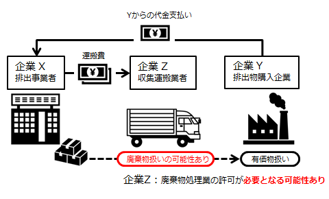 企業X(排出事業者)の排出物を企業Y(排出物購入企業)が有価で購入した場合、その排出物は有価物と判断でき、廃棄物処理法は適用されません。しかし、もし企業Xが企業Yから受け取った代金よりも、企業Xが企業Zに支払った運搬費の方が高い場合、この取引に関して、企業Xはコストを負担しているということになります。