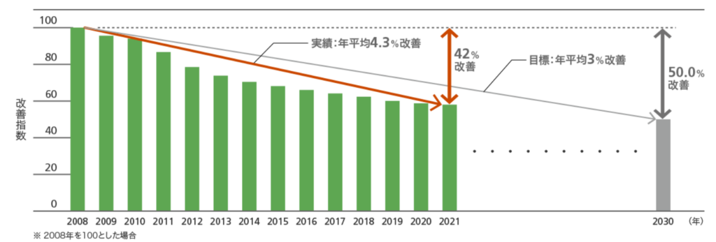 ▼ライフサイクルCO2製品1台当たりの改善指数推移 (キヤノン株式会社HPより)
