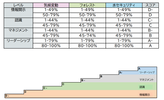 A.CDPのスコアはAからDで表示されます。回答結果に基づき企業が環境スチュワードシップのどの段階であるかを示す指標となります。なお、無回答の場合、スコアはFと表示されます。