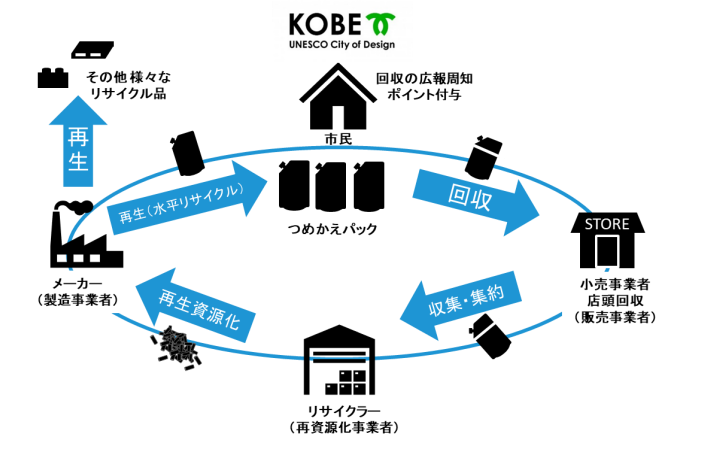 つぎに、企業が行政とパートナーシップ※を組み、水平リサイクルに取り組んでいる事例を紹介します。神戸市と小売り・日用品メーカー・リサイクラーは、一度市場に出回った洗剤やシャンプーなど使用済みのつめかえパックを水平リサイクルできるようにするため、2022年12月時点で同市内小売75店舗・3施設に回収ボックスを設置し分別回収を行っています。