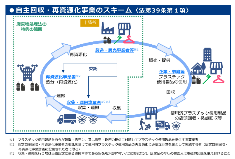 本認定制度では、製造・販売事業者等が「自主回収・再資源化事業計画」を作成し、国の認定を受けることで、廃棄物処理法に基づく許可がなくても、使用済みプラスチック使用製品の自主回収・再資源化事業を行うことが定められました。これまで複数の自治体にまたがって自主回収・再資源化事業を行う場合、自治体ごとに業の許可が必要でしたが、この認定を受けることでそれぞれの自治体の許可を受けずに自主回収・再資源化事業を行うことができます。
