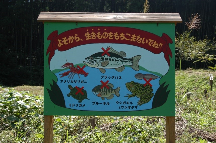 水辺の外来生物の持ち込みを禁じたレジャー施設の普及啓発看板