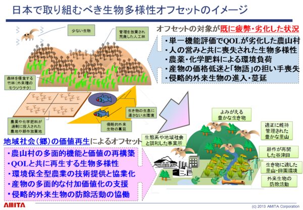 このように、企業が里山や田園の地域社会にコミットし、農林水産業の営みや地域社会のあり方と共に生物多様性の向上を目指す手法こそが、我が国における生物多様性オフセットの望ましい姿と言えるでしょう。