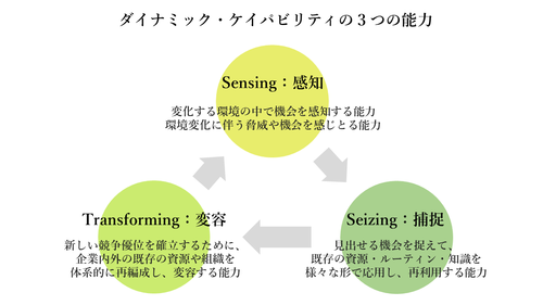 | ダイナミックケイパビリティ | 企業が環境の変化を感知し、そこに新ビジネスの機会を見出し、そして既存の知識、人材、資産(一般的資産)およびオーディナリーケイパビリティを再構築・再編成する能力のこと。現代のように不確実性が高く、変化の激しいビジネス環境下で求められる。 |