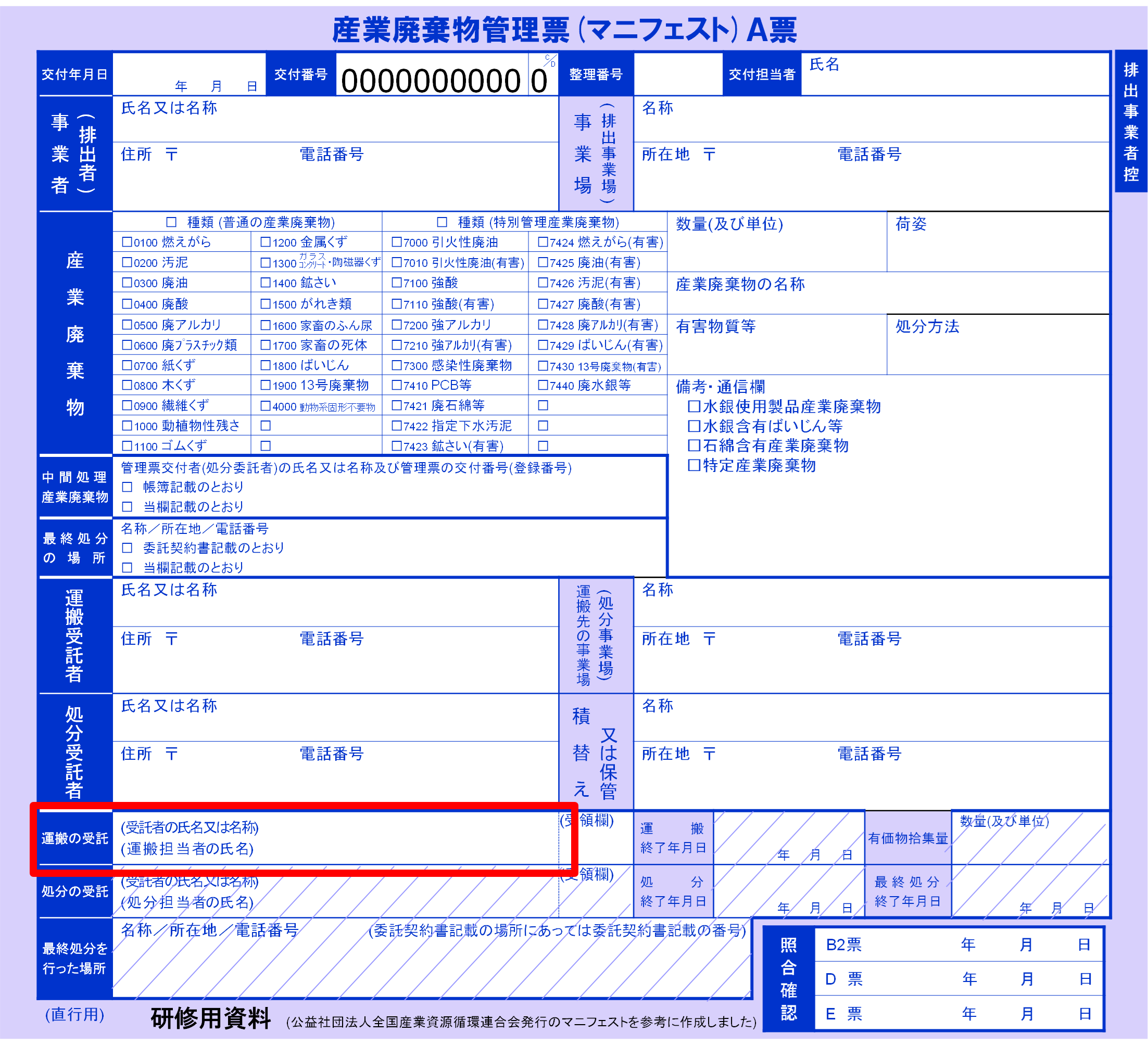 A票の『運搬の受託』欄は「収集運搬会社が廃棄物を間違いなく受け取ったことを確認するための欄」ですので、排出事業者が事前に記入しては意味がありません。引渡時に、運搬会社の担当者に記入してもらいます。