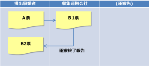 たとえば、廃棄物を横持ち(A工場→B工場への移動)して保管や自社処分を行う場合、運搬のみを収集運搬会社に委託することがあります。この場合、マニフェスト伝票はA、B1、B2票の運用となります(図1)。