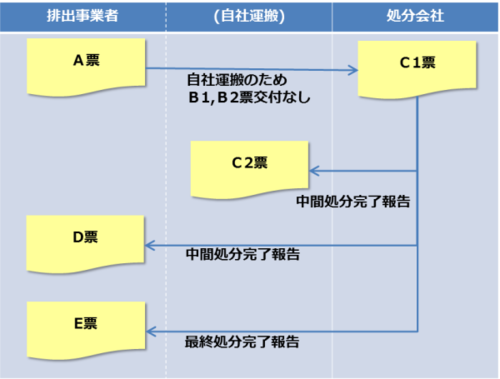 中間処分会社の処分場まで自社運搬する場合、マニフェスト伝票はA、C1、C2、D、E票の運用となります(図2)。