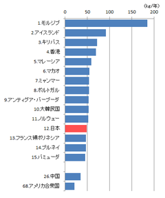 一方「世界一魚を消費する日本」と言われたのは今や昔。国連食糧農業機関(FAO)の統計によると、日本国民1人当たりが消費する水産物の量は世界でなんと12位(図2)。魚離れが進んでいることがうかがえます。とはいえ、国全体でみれば中国、インドネシア、アメリカ、インドに次ぐ5位、輸入金額でみればアメリカに次ぐ2位と、日本がまだまだ多くの水産物を消費し、かつ海外に依存していることが分かります。