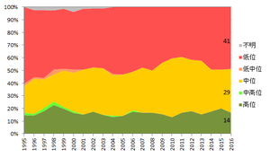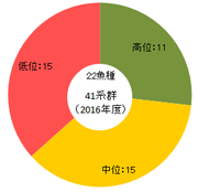水産庁では日本近海の50魚種84系群の資源量を評価しています。最新の評価によると、約半数が低位、すなわち枯渇またはその危険性があるとしています(図4)。一方、マグロのような排他的経済水域を超えて移動を行う回遊魚は国際協力のもと資源評価が行われており、22魚種41系群のうち約3分の1で低位と評価されています(図5)。この中には、太平洋のクロマグロとメバチ、そしてミナミマグロも含まれています。これらの種は国際自然保護連合(IUCN)によって絶滅危惧種に指定されています。すべての魚種が減っているわけではないものの、この先、安心して食べられる状態とは言えないようです。