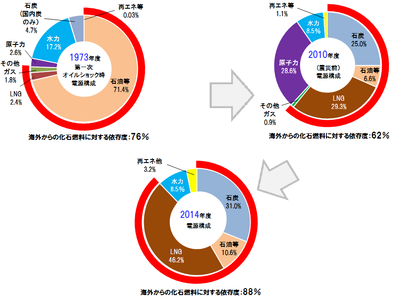日本の火力発電は、海外から輸入される石油・石炭・天然ガス(LNG)などの化石燃料に大きく依存しており、依存度は2014年度で88%(電源構成ベース)です。これは、第一次石油ショック時よりも高い数字です。