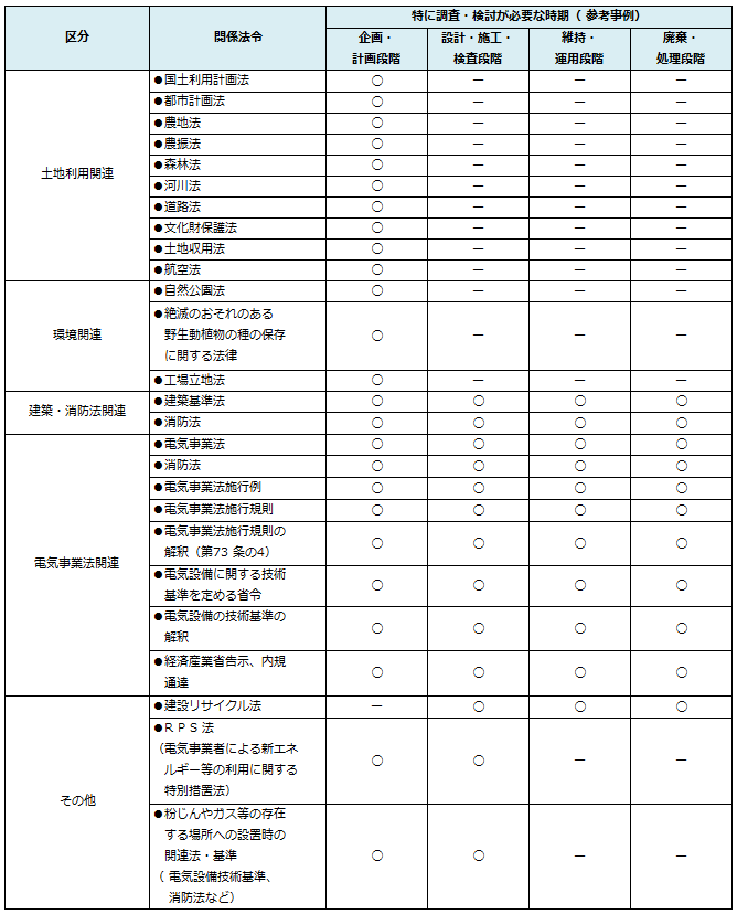 一定規模以上になる太陽光発電を設置する場合、各種の法令に対し許可や届出が必要となります。企業における太陽光発電を設置する場合に該当する主な法令を下記に明記します。事前に確認し漏れのない届出申請をしましょう(設置する場所によっては、農地法・河川法なども該当します)。