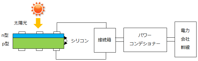 太陽光発電(太陽電池)はシリコンなどの半導体で作られています。この半導体に光が当たると電気が発生するしくみになっています。ちなみに、太陽電池は英語ではPV(Photovoltaic cell=光起発電)と呼んでいます。システムを構成している主な機器は大きく3機器で構成されています。