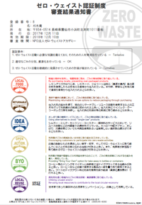 事業規模によってインパクトの大小は様々ですが、こうした「ごみ監査」を通じて、そもそも使わなくてもいいものや、他に活用できるはずなのに無駄にしてしまっているものを洗い出し「使わない」選択肢を取ることで、仕入れのコスト削減、そして事業所によってはごみ処理のコスト削減にも繋がります。自社の事業を検証する際には、ぜひ会計監査だけでなく「ごみ監査」にもトライしてみてはいかがでしょうか?(画像は「ゼロ・ウェイスト認証制度」審査結果通知)