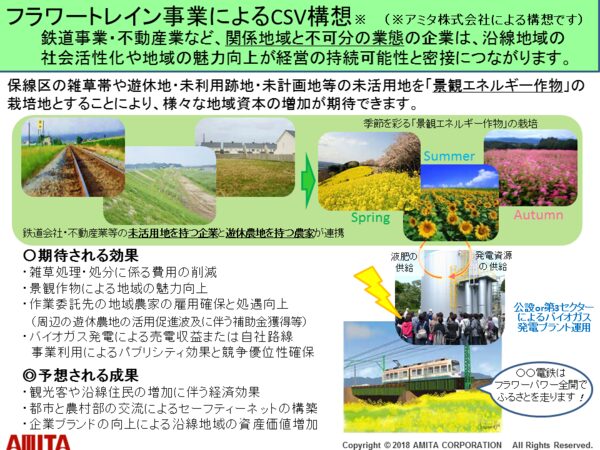 さらに、自社の未利用保線区や沿線工業地帯の遊休地でも「景観エネルギー作物」(菜の花やヒマワリなど)の栽培で新たな価値を創出できます。「景観エネルギー作物」は、四季を鮮やかに彩るだけでなく、バイオガスプラントの発電用資源とすれば、鉄道車両の動力を再生可能エネルギーに転換していくこともできます。沿線住民の家庭からの生ごみもバイオガスプラントの発電用資源となります。このような取り組みを展開することで、鉄道事業を単なる「乗客の移動手段」ではなく「沿線地域の関係性を豊かに結び、住民の幸福と安心を運ぶ事業」に昇華させることが可能になるのです。そのような鉄道会社の路線価はうなぎ上りになるでしょう。このような取り組みこそが、真のCSV(共有価値の創造)なのです。