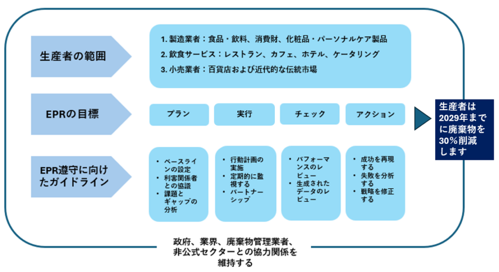 生産者別EPR廃棄物削減ロードマップ(2020-2029)では、2029年までに発生源での廃棄物を30%削減し、廃棄物処理を70%削減するという目標が設定されました。一度市場に出回った使用済みパッケージの改修やPCR材で作られたパッケージを導入するといった方法で達成を目指しています。現状は義務化まで至らず、企業の自主的な取り組みに留まっています。