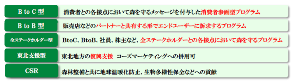 J-クレジットでは、例えば企業がボイラー機器を省エネ型に入れ替える等、クレジットの創出方法は様々で個別プロジェクトごとに認証され、クレジットが利用されています。フォレストック認定はクレジットの創出方法が限定されているため、購入する企業がコーズマーケティングアプローチ(注3)を通じた企業活動と一体化した社会貢献活動の導入を実施しやすいといえます。
