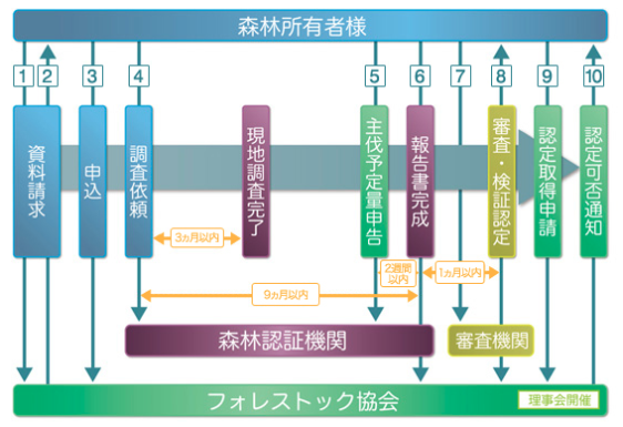認定取得手続きの申込から認定取得までは、森林認証機関による対象森林に関する現地調査と同報告書作成期間(約3カ月から9カ月)に加えて、審査機関における審査期間(約1カ月)とフォレストック協会における認定審査(約1カ月)を含め、全体では約6カ月前後必要です。右図のように、認定の取得希望者はフォレストック協会の他、森林の調査・審査手続を実施するため森林認証機関(図紫色)及び審査機関(図黄緑色)とのやりとりが必要です。図中①から⑩までが、書類のやり取りが発生するタイミングです。(図は認定取得の流れ。クリックすると拡大します。)