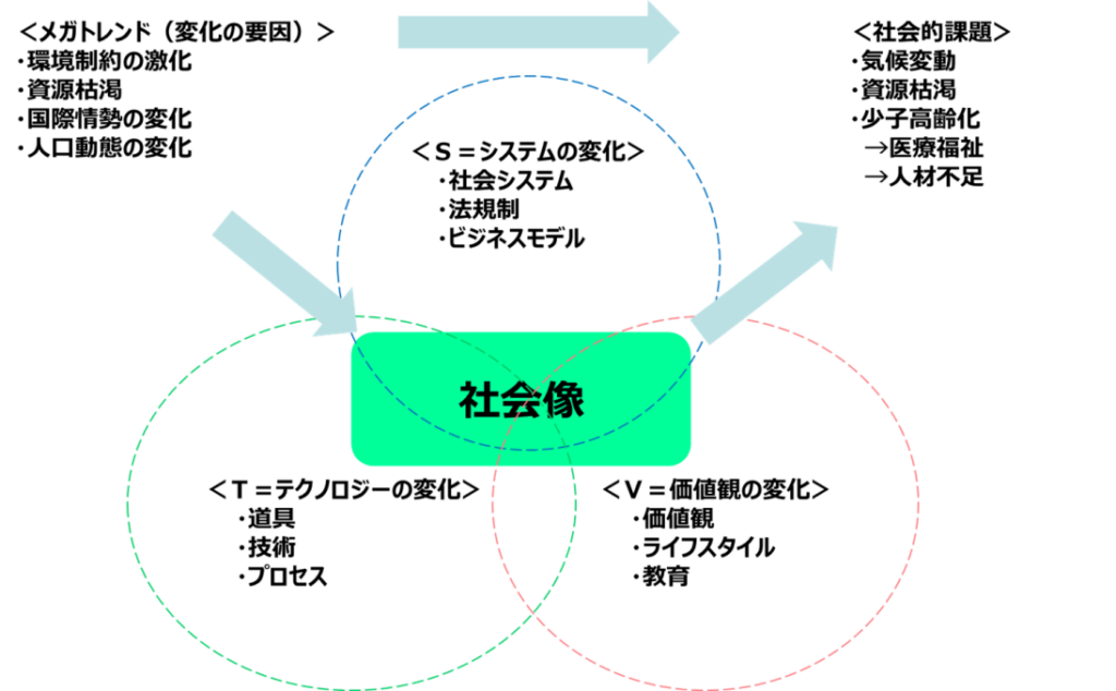 ▼アミタ作成:システム・テクノロジー・価値観の変化から社会像を捉える(イメージ図)