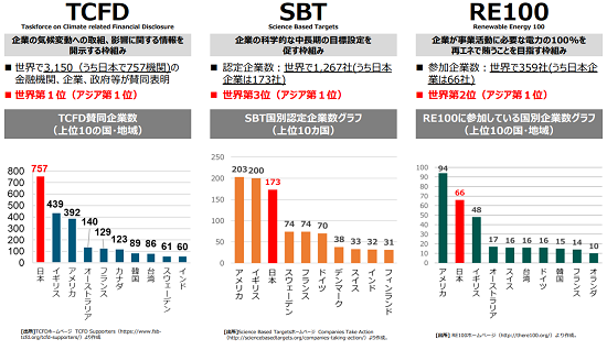 脱炭素においては社外への取り組みの発信も企業価値を上げていくために重要になります。各企業は情報開示を強化するため、SBT、TCFD、RE100といった各種イニシアチブに参画しており、2022年3月時点の環境省の調査によれば、日本企業の参画は世界でもトップクラスとなっています。