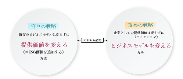 しかし、既存のビジネスモデルをいくら「改善」しても、CO2や廃棄物の排出量をゼロにするということはほとんど不可能であると言われています。だからといって、既存のビジネスモデルを完全になくすということは現実的ではないでしょう。カーボンニュートラルやサーキュラーエコノミーを実現するためには、CO2や廃棄物の排出がそもそもゼロであるという前提に基づいた新しいビジネスに投資をし、可能な限りシフトチェンジしていく「攻めのESG」が必要です。