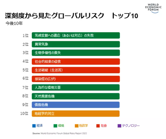 その要因の一つが、気候変動や資源枯渇といった地球環境の制約の深刻化です。世界経済フォーラムが発表した2022年の世界の重大リスクでは感染症をはじめ、気候変動対策の失敗や異常気象、生物多様性の損失、債務危機などが挙げられています。