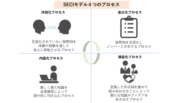 SECIモデルでは、組織の中で新しい知識が生まれることを以下の4つのプロセスで説明しています。
