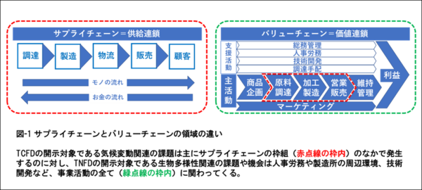 このメソッドを活用した対応策として、別シリーズのコラムでも述べたとおり、TCFDにおけるCO2排出量と同様のサプライチェーン(供給網)での対応策と、TNFDならではのバリューチェーン(価値連鎖網)での対応策に分けて説明しましょう【図-1】。