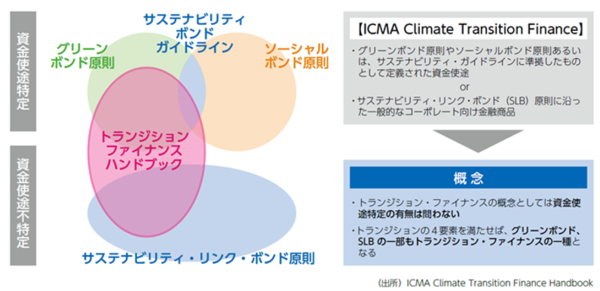 トランジション・ファイナンスに関する国際的なガイダンスとして、ICMA(国際資本市場協会)が2020年12月『クライメート・トランジション・ファイナンス・ハンドブック』を公表しました。これによれば、クライメート・トランジション関連の目的を持ち、以下(1)(2)のいずれかの形式により、発行された債券への資金供給を促進することを目的とする投資がクライメート・トランジション・ファイナンスであると定義されています。