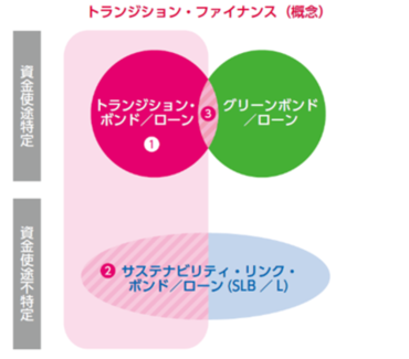すなわち、日本におけるトランジション・ファイナンスとは、下図の①~③に該当する債券等の金融商品のことを指し、資金使途が特定されるトランジションボンド/ローン、グリーンボンド/ローンと、資金使途が特定されないサステナビリティ・リンク・ボンド/ローンに大別されます。