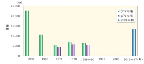 ▼瀬戸内海の藻場・干潟面積の推移(響灘を除く)