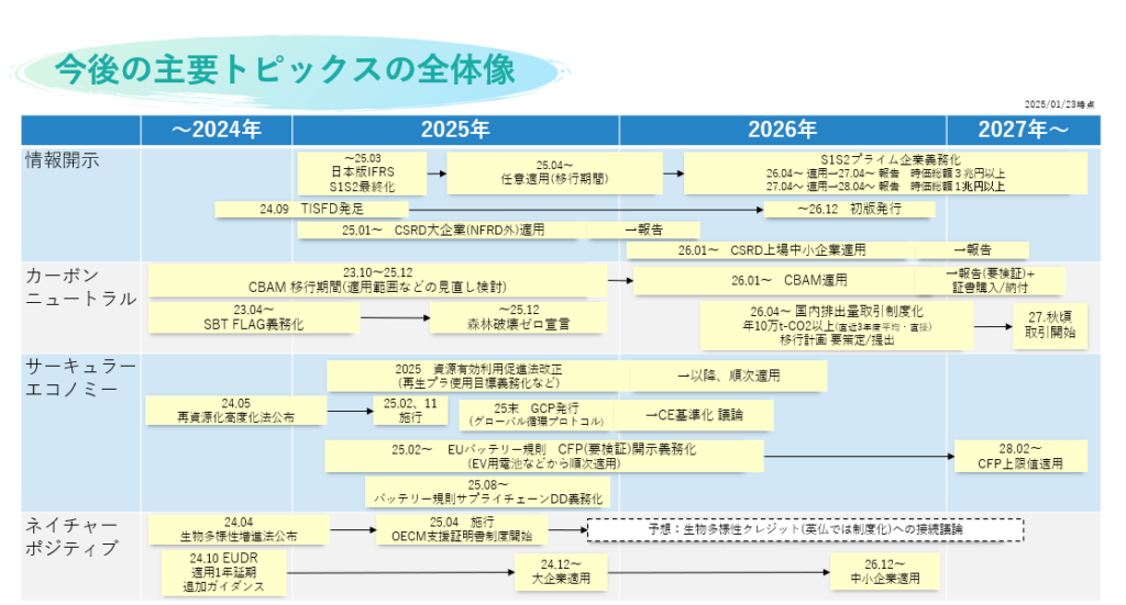企業がぜひ押さえておきたい、2025~2026年のサステナビリティの主要トピックスを、下図のようにまとめました。
