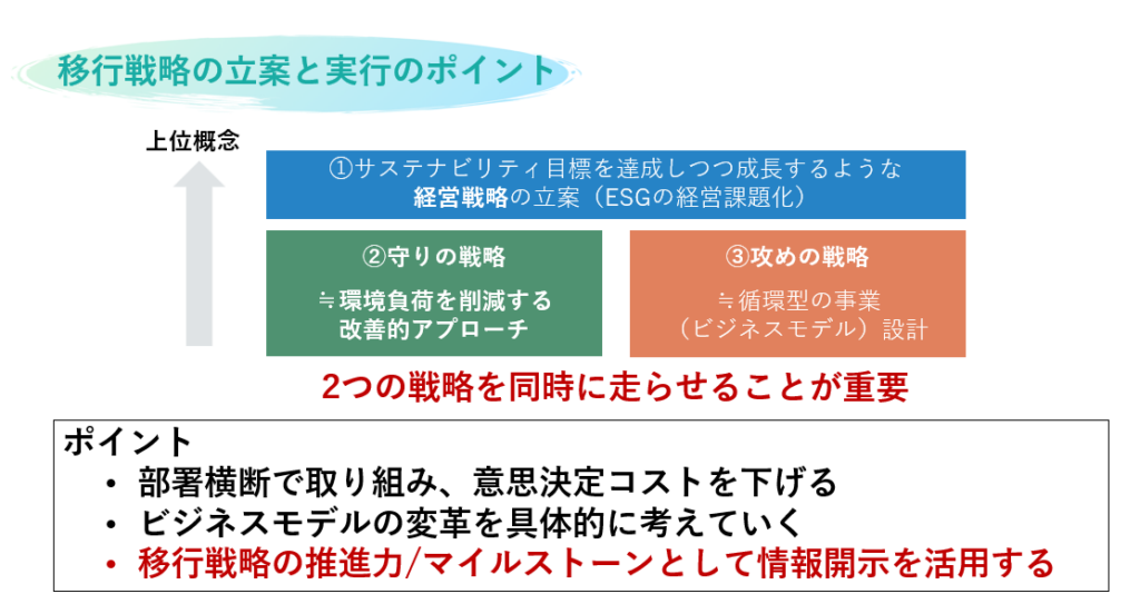その立案と実行においてはまず、社内のコミュニケーションや意思決定にかかるコストを下げるために、タスクフォースなど部署横断型の取り組むことがポイントです。また、カーボンニュートラルやサーキュラーエコノミーは、従来のビジネスストラクチャの中では実現が難しく、ビジネスモデルの変革を具体的に考える必要があります。そして、情報開示はゴールではありませんが、取り組みを前に進める推進力やマイルストーンとして活用できます。になり得ます。情報開示をうまく使いましょう。