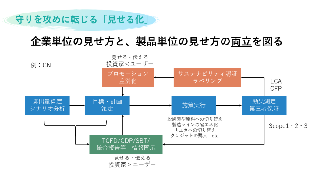 削減取り組みやその効果の見せ方が、外部イニシアチブ対応だけに留まれば「守りの施策」ですが、サステナビリティ認証の取得やラベリングなどを含めて製品のプロモーションに活用すれば「攻めの施策」に転じることができるのです。