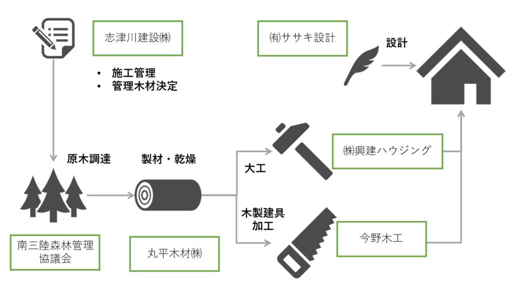 そのような中、新築戸建住宅ではFSC全体プロジェクト認証の事例がこれまでになく、南三陸町内でCoC認証を持つ建設会社(志津川建設)が手掛けることでプロモーションにもなります。町の山の材がより住宅に使われることを期待し、国内初を目指しました。