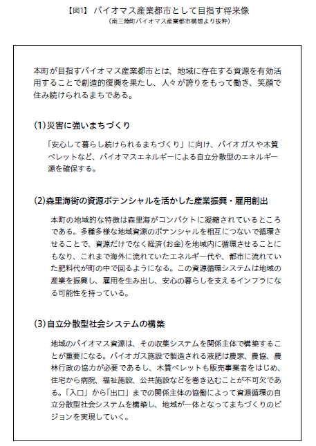 バイオマス産業都市構想とは、地域にあるバイオマス資源を活用し、収集・運搬、製造、利用までの一貫的な経済システムを構築するものだ。バイオマスの利用を通じた産業創出や循環型エネルギーの強化による、環境に優しく災害に強い地域づくりの構想の妥当性が国に審査されるのである。単なる絵空事ではなく、収支計画を含めた事業性も問われる。このため、申請に向けて連日連夜で官民の両者が意見を交えながらの構想案が練られた。そして2014年に南三陸町のバイオマス産業都市構想が認定を受け、バイオガスプラントの事業計画が一気に加速していくこととなったのである。そこで目指されている町の将来像と理念は【図1】のとおりだ。
